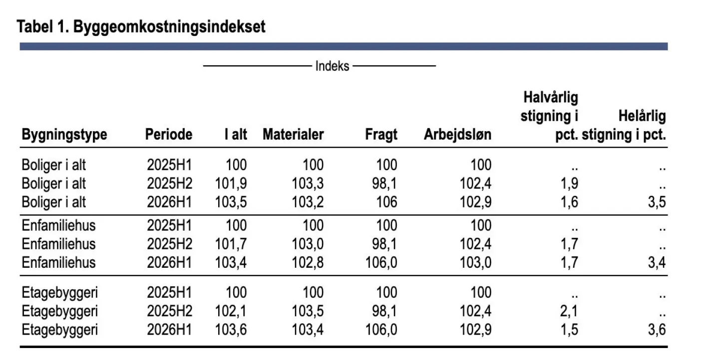 I en nyligt udgivelse oplyser statistikkontoret, at den helårlige ændring i byggeomkostningsindekset opgjort pr. 1. januar 2026 var på 3,5 procent for boliger i alt.