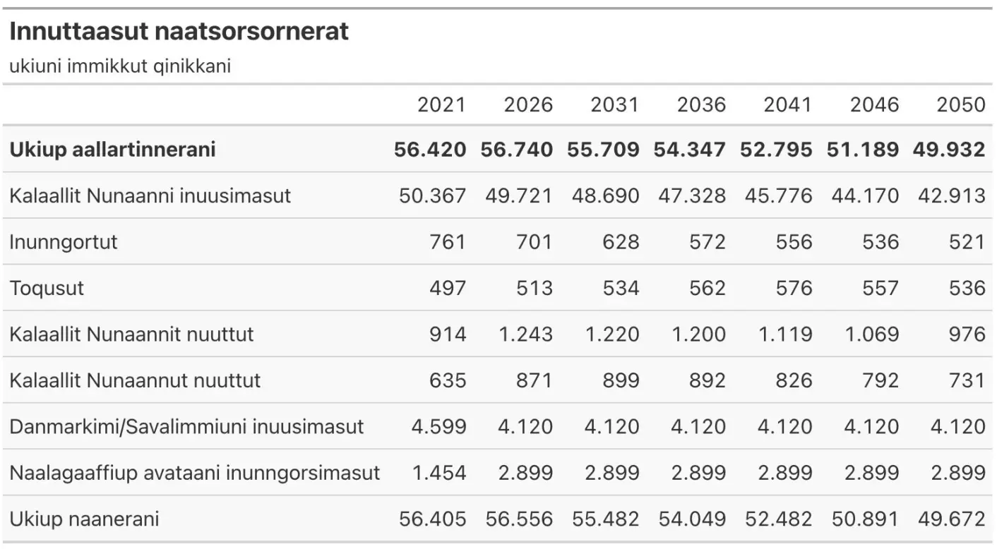 Kisitsisit ineriartornerat takussutissami ataani takuneqarsinnaavoq. Innuttaasut Kalaallit Nunaanni inunngornikut 2026-mi 49.721-upput, taakkulu 2050-imi 42.923-nut ikileriarsimanissaat naatsorsorneqarluni.