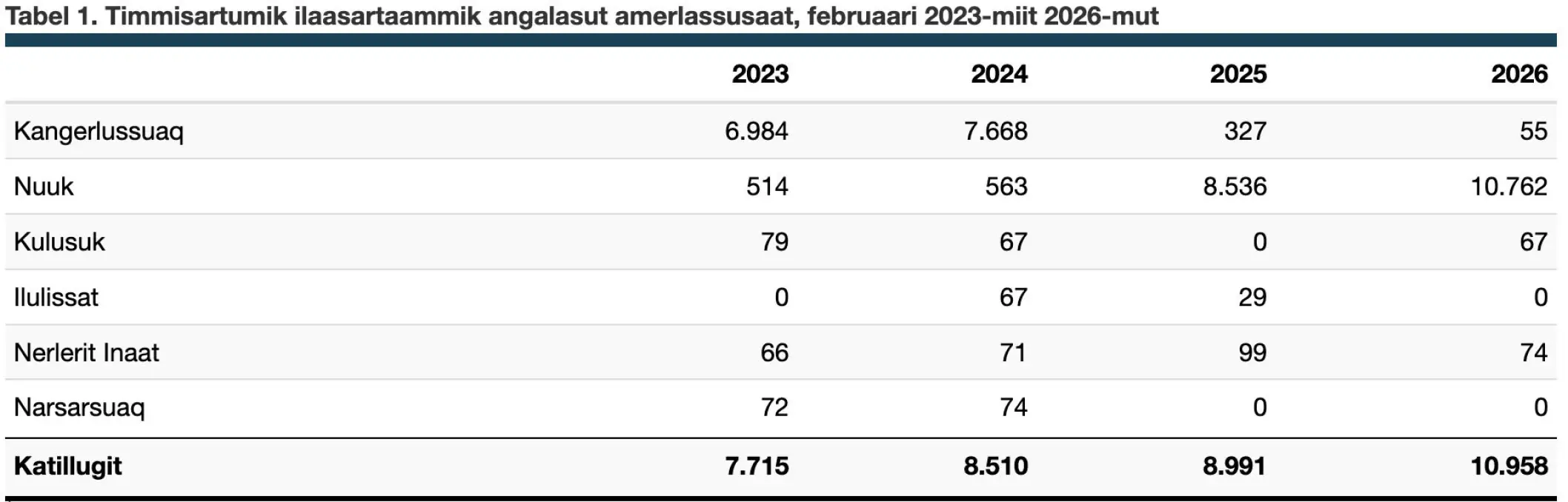 Timmisartumik angalasut 2026-mi januaarimiit februaarimut 10.958-iupput, tassa ukiup siulianut sanilliullugu 21,9 procentimik amerlanerullutik.