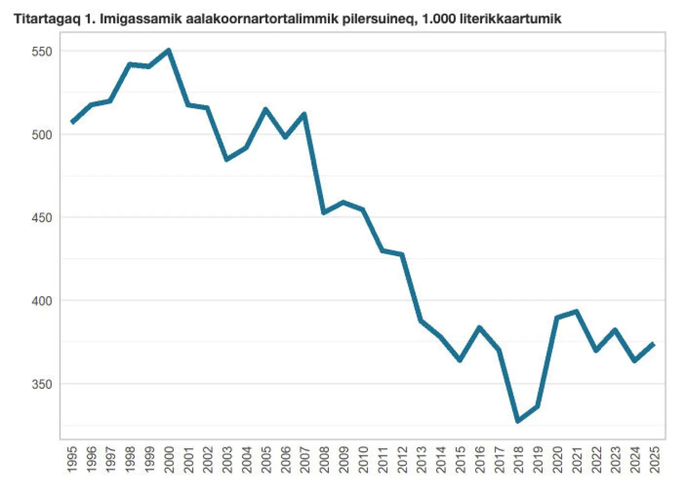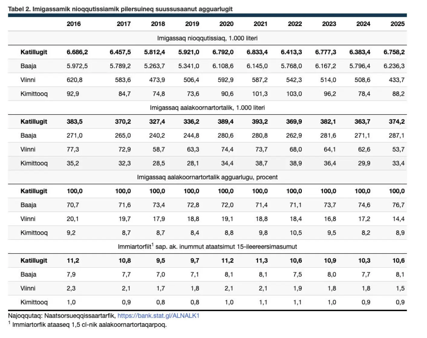 2025-mi imigassaq 374.000 literi nunatsinnut eqqunneqarlunilu tunisassiarineqarpoq, tassa 11.000 literinik, imaluunniit 2,9 procentinik, amerleriarluni.