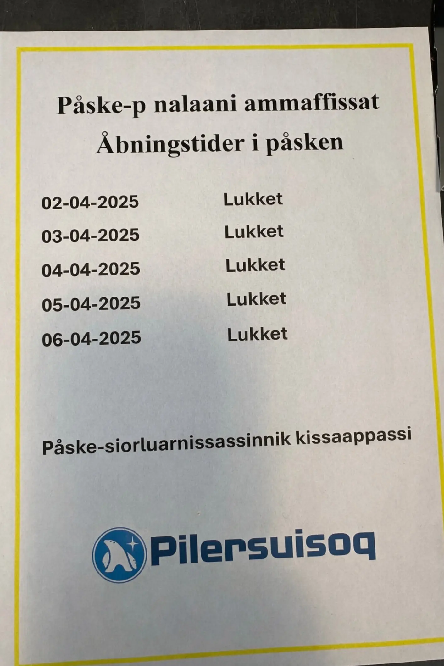 – Da jeg kiggede på mine billeder, fik jeg idéen til at redigere et af dem med ChatGPT (kunstig intelligens, red.). Jeg valgte et billede af Pilersuisoq i Qaanaaqs åbningstider i påsken og ændrede det, så der stod, at der var lukket, fortæller Aqattannguaq Qaerngaaq, borger i Qaanaaq, til AG.