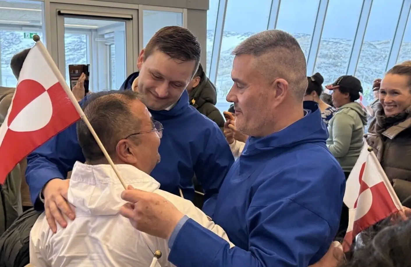Kim Kielsen og Jens-Frederik Nielsen modtages med kram i den nye lufthavn. Foto: Morten Okkels -