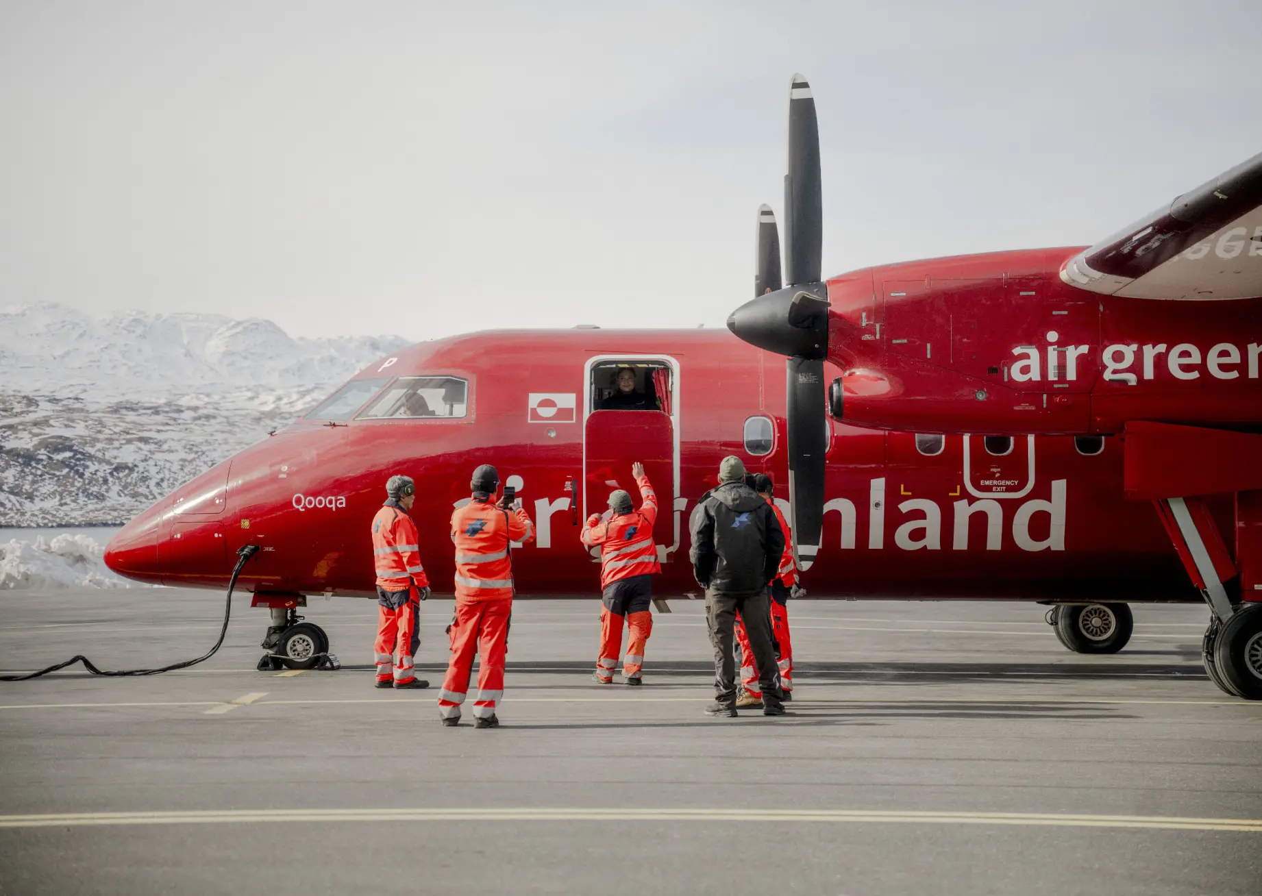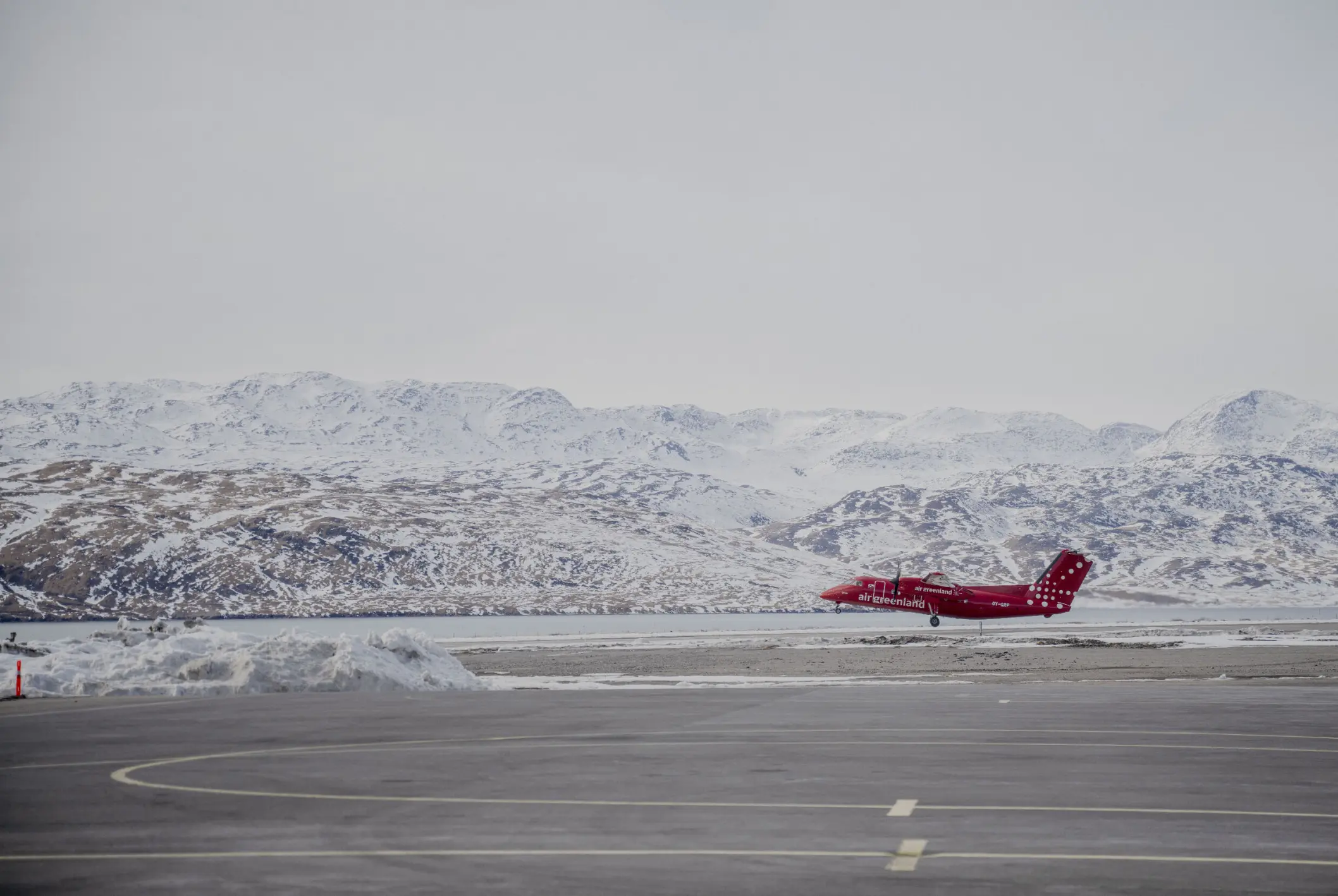 Fuldstændig naturligt og uberørt af dagens tunge begivenhed løfter den tonstunge Dash-8 sig fra Narsarsuaq karakteristiske landingsbane med de flade fjelde i baggrunden.