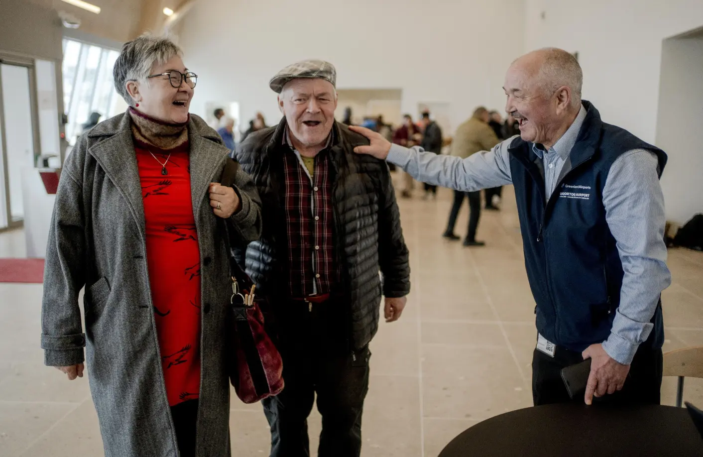 Passagerer, ansatte og gæster råber hurra og vifter med flag i ankomsthallen: Det første officielle fly er netop landet i den nye lufthavn i Qaqortoq.
