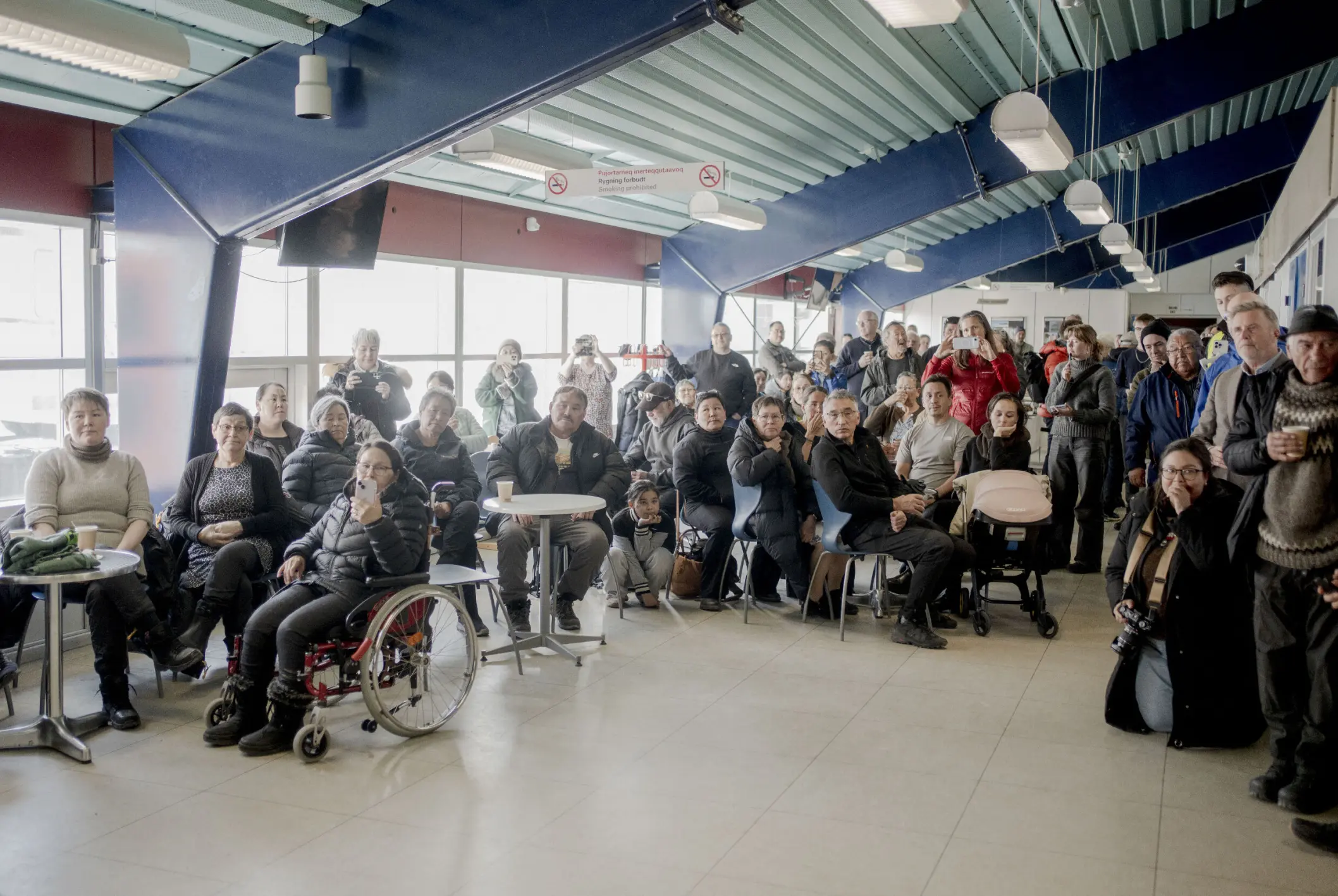 Forsamlingen tog billeder, men var ellers ret stille, da det røde fly satte kurs mod skyerne. Og det var det sidste fly i Narsarsuaq.