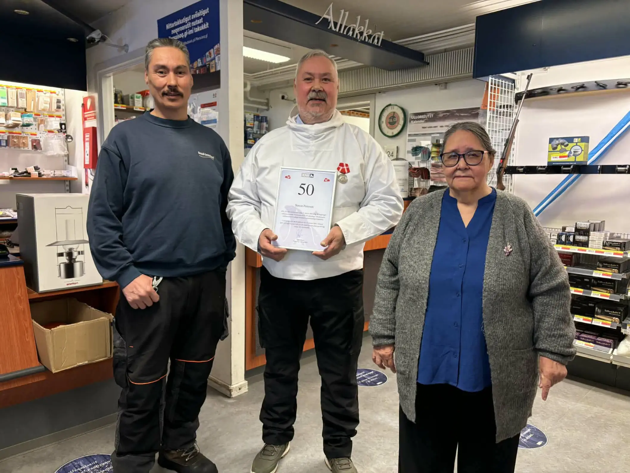 Den styrke fulgte ham videre i livet. Fra den kolde tørvehytte, der i dag er trådt ind i varmen fra butikken. Døren til Pilersuisoq går op og i, kunder hilser, og stemmen bag disken er velkendt. Det er Simon Petersen. 50 år efter sin første arbejdsdag står han stadig samme sted - nu med et halvt århundrede bag sig i bygdens butik.