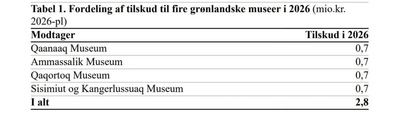- Tilskuddet har til formål at styrke grønlandske museers arbejde med at formidle, bevare og fremme den lokale kulturarv, herunder i form af forbedrede udstillingsrum og tidssvarende magasiner, oplyser Kulturministeriet, der fik godkendt et såkaldt aktstykke den 6. marts af Folketingets Finansudvalg.