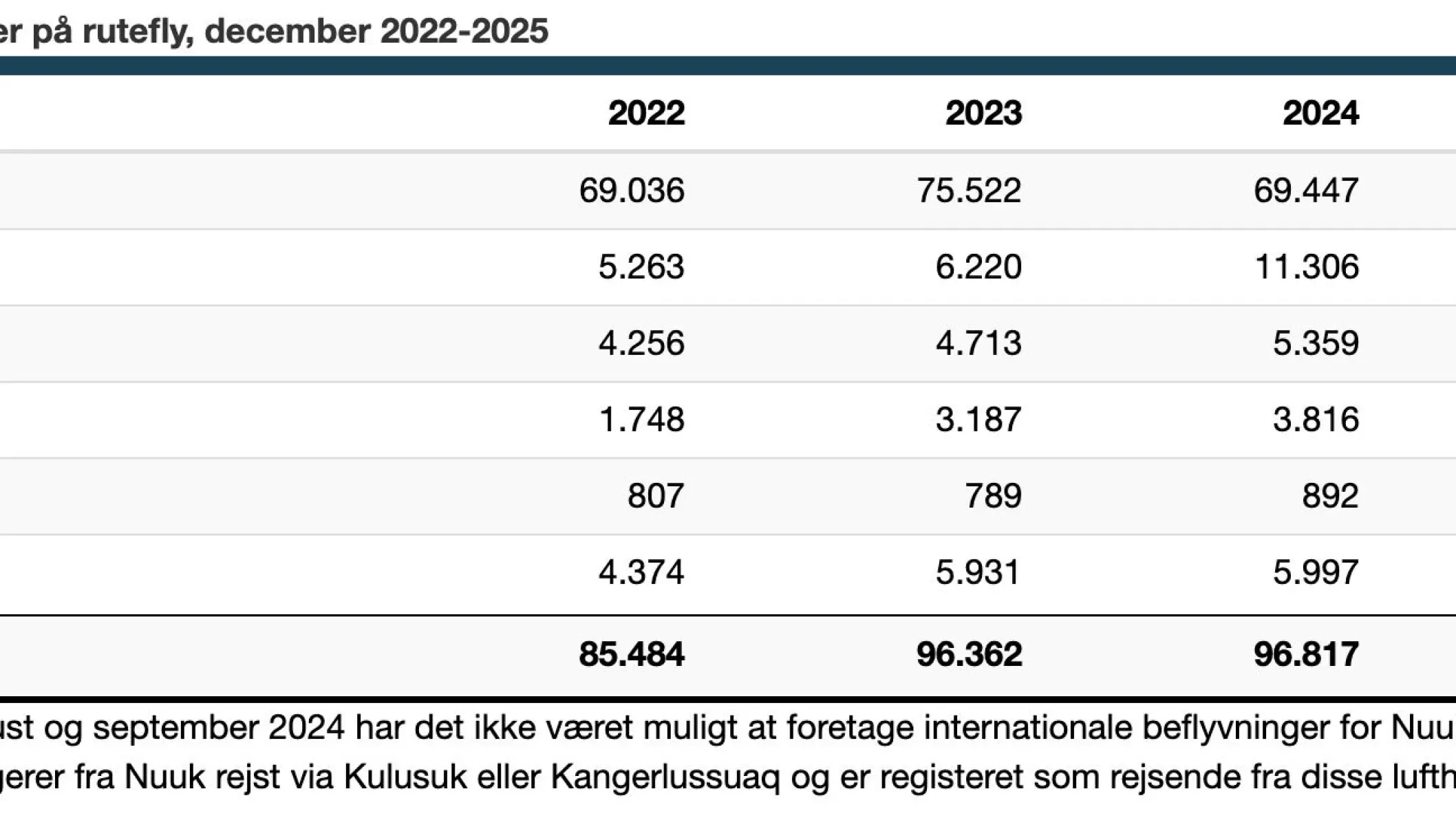 Størstedelen af trafikken er foregået via Nuuk Lufthavn, som i november 2024 overtog rollen som knudepunkt for flytrafikken fra Kangerlussuaq.
