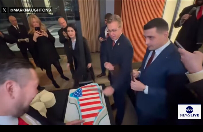 I videoen dukker den grønlandske MAGA-tilhænger Jørgen Boassen op og fortæller, at han kommer fra Sydgrønland. Herefter skærer Andy Ogles et stykke af kagen ud til ham.