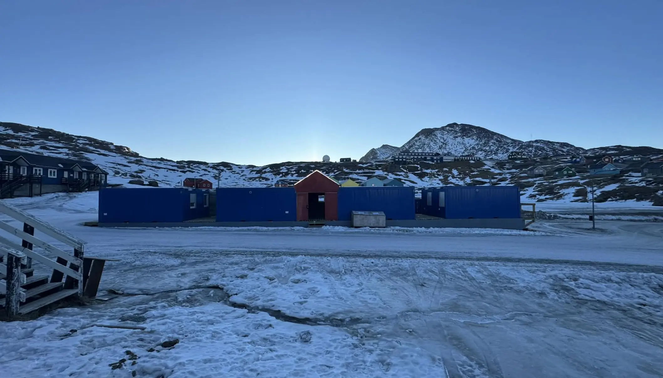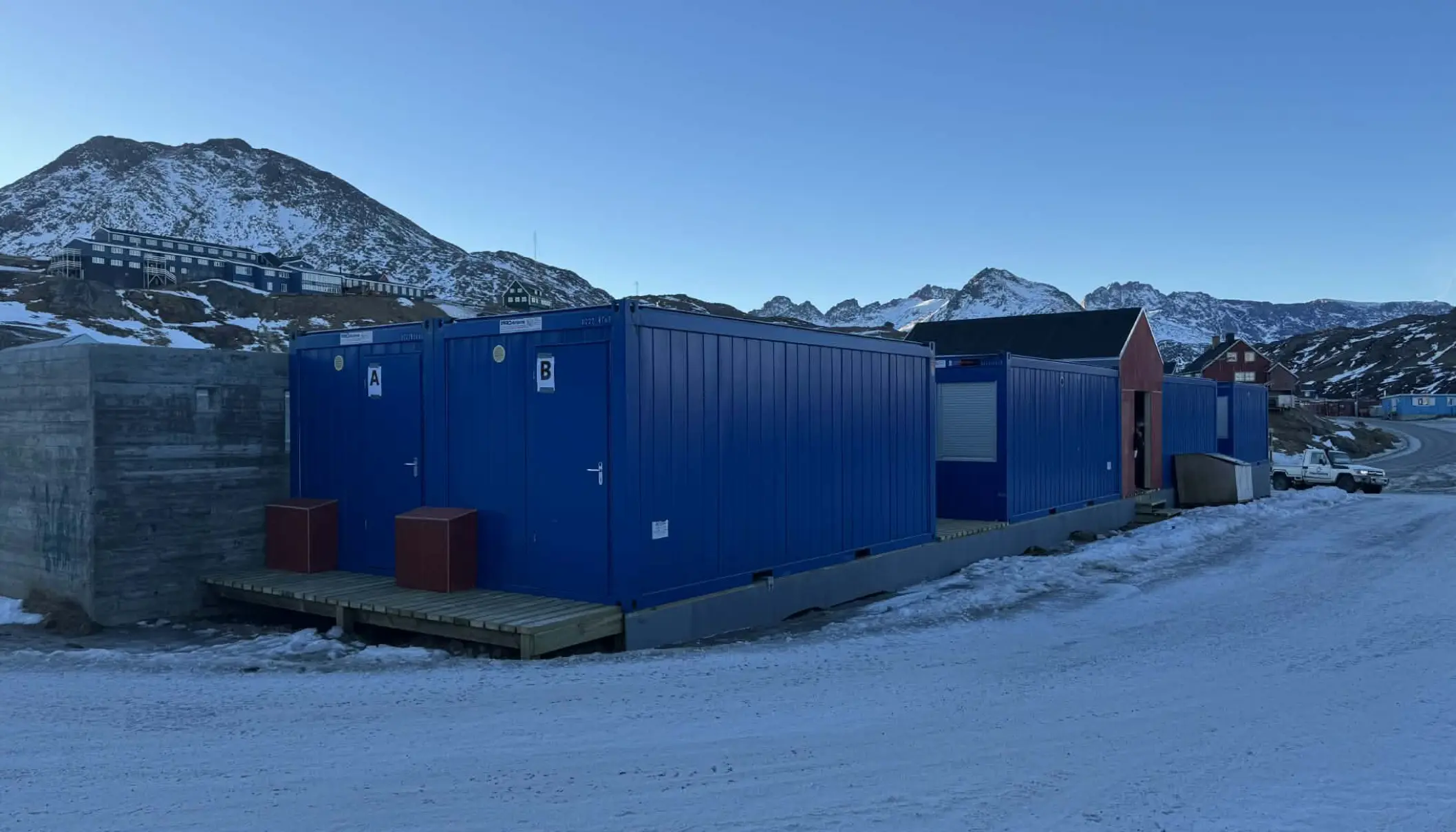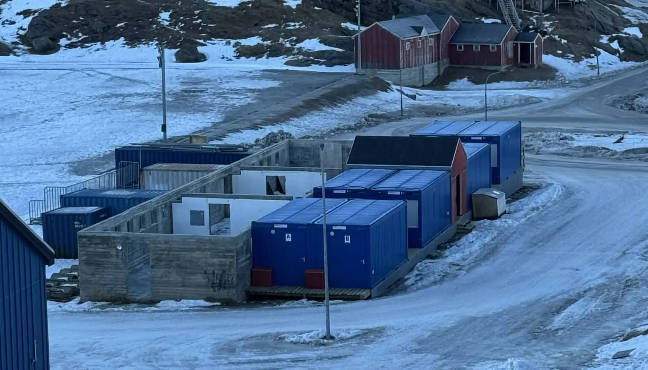 Når man ser området omkring fodboldbanen i Tasiilaq, er det svært at undgå at lægge mærke til de otte containere.