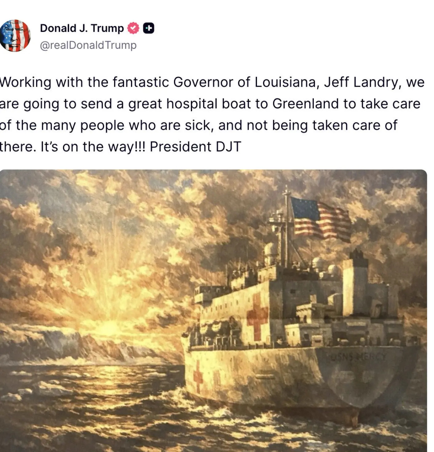 Den amerikanske præsident Donald Trump annoncerede søndag på Truth Social, at han ville sende en hospitalsbåd til Grønland for "at tage sig af de mange syge mennesker, der ikke bliver taget hånd om".