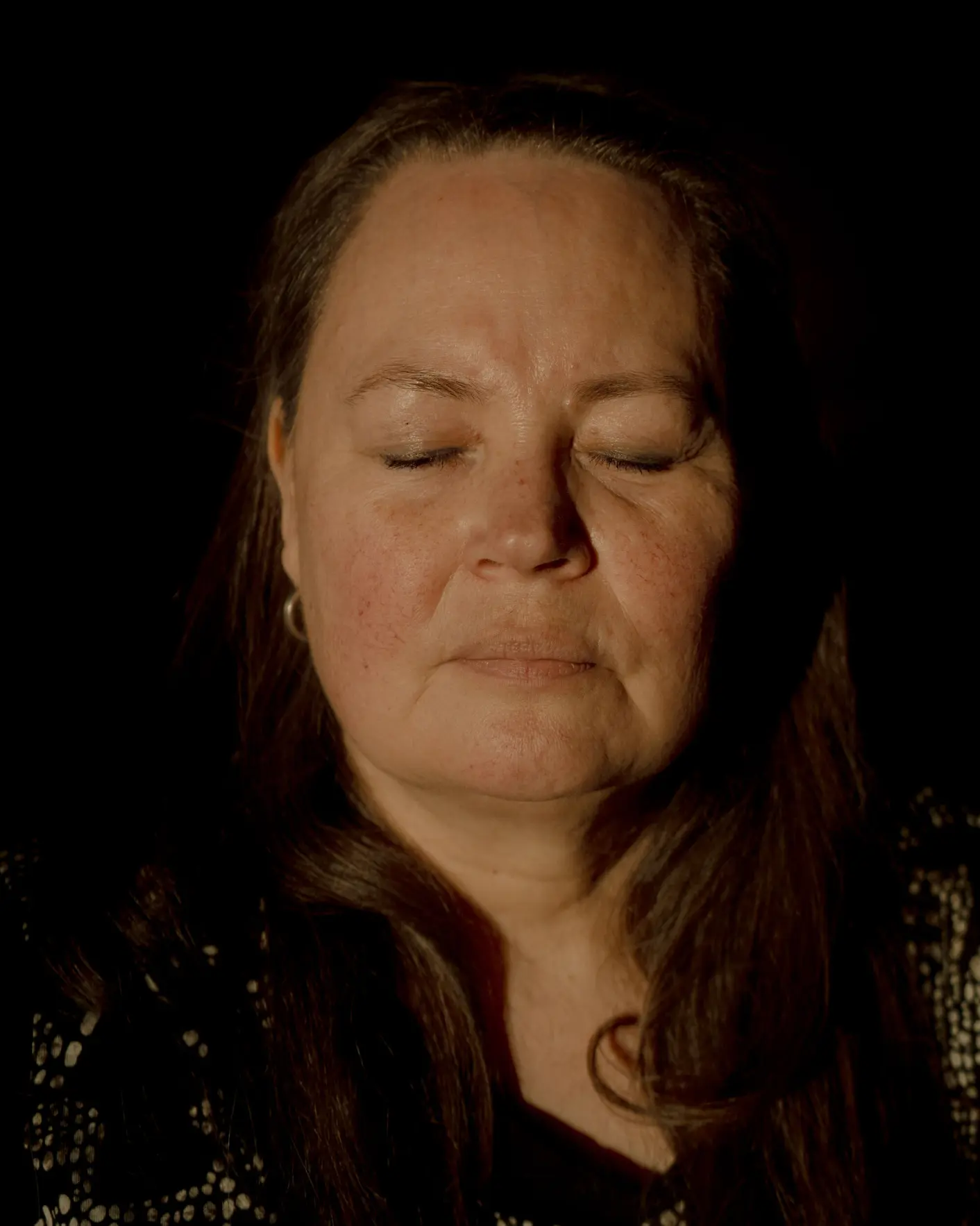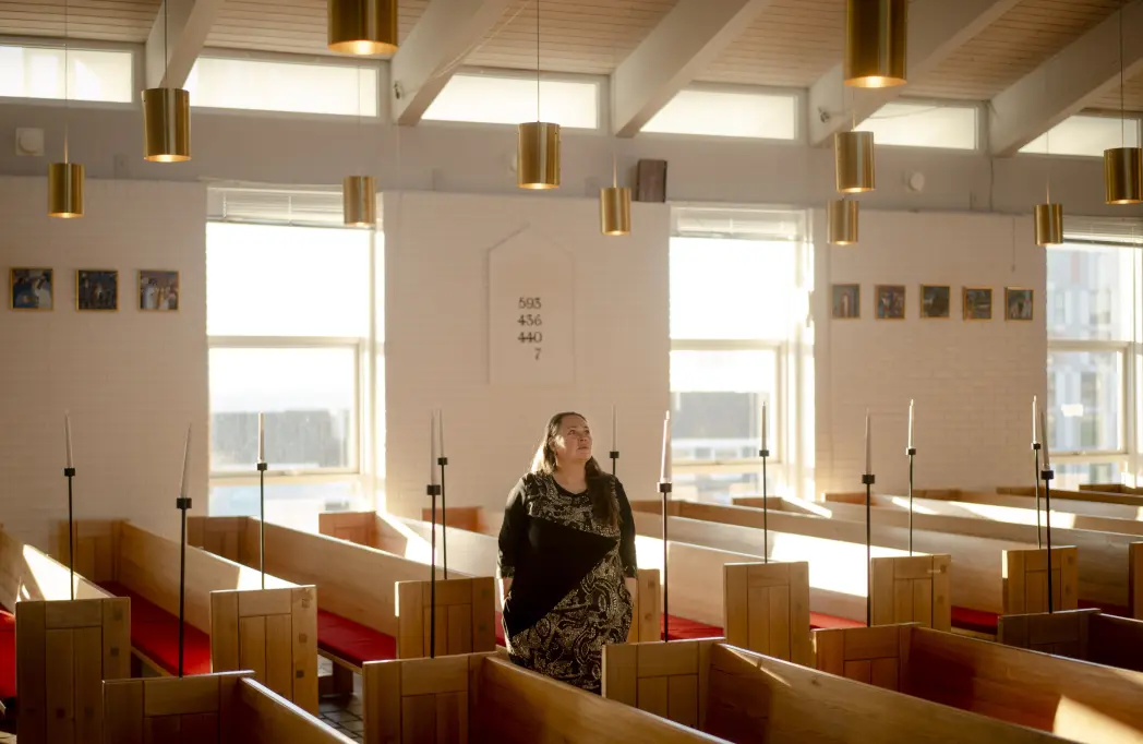Aviaja Rohmann Hansen har lukkede øjne. Hun sidder i præsterummet i Hans Egede Kirke  – et lille lukket rum med hvidkalkede vægge og trædør.
