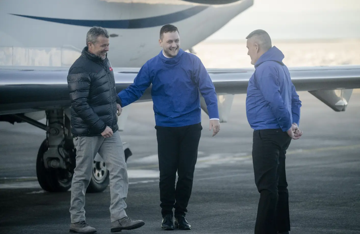 Kim Kielsen og Jens-Frederik Nielsen tager imod Kong Frederik. Oscar Scott Carl