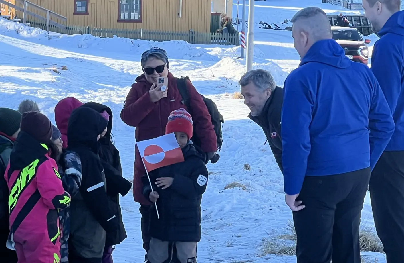 Kongen hilser på de fremmødte børn. Foto: Arnaq Nielsen Sermitsiaqs reporter melder om en del fremmødte borgere, og naturligvis også et vist sikkerhedsopbud i form af politi.