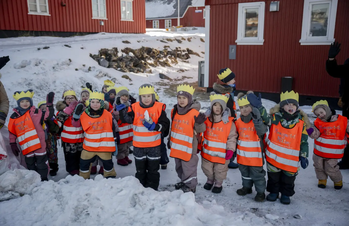 Undervejs har kongen hilst på børn fra børnehaven Mikisoq.