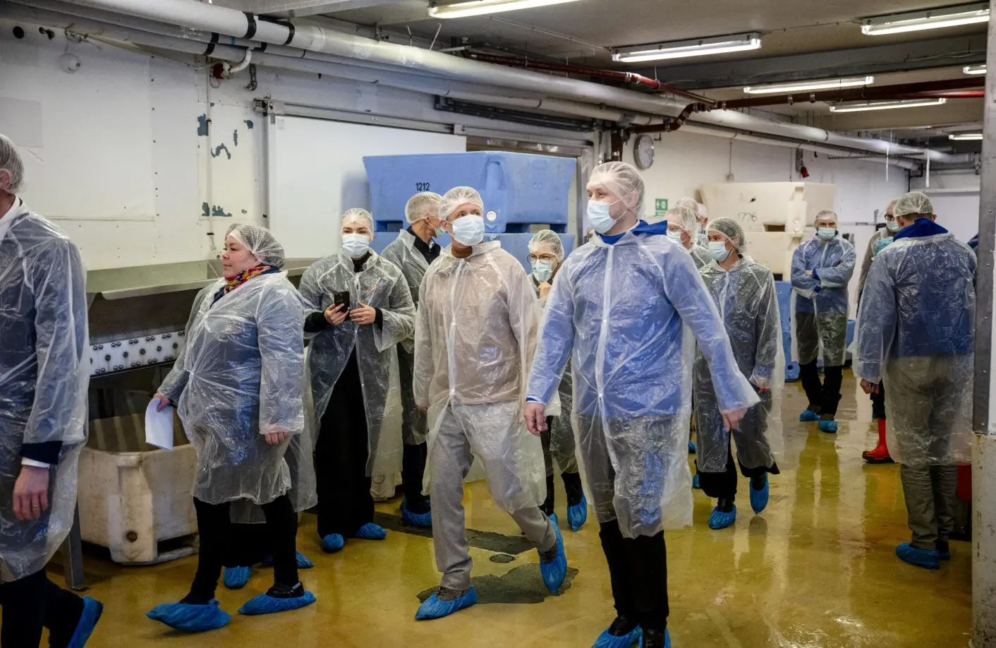 Kong Frederik og Jens-Frederik Nielsen får rundvisning på Royal Greenlands fiskefabrik. Oscar Scott Carl -