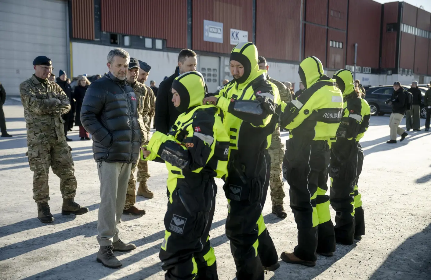 Her hilser elever fra Arktisk Basisuddannelse på kongen ligesom de også viser udstyr frem for Kong Frederik og Jens-Frederik Nielsen.