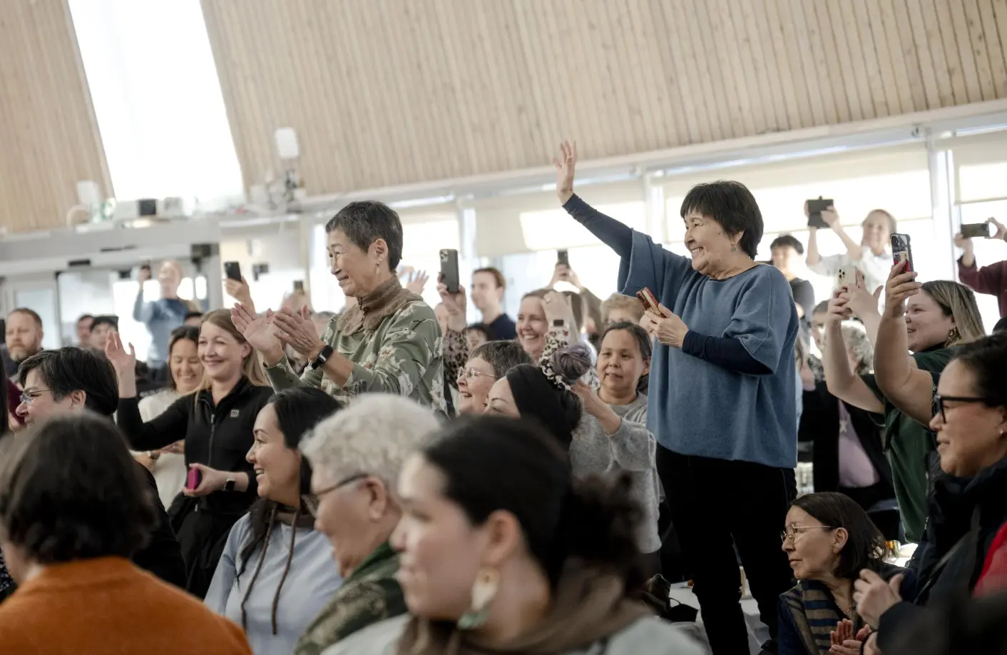 Der er klapsalver og jubel, da kong Frederik ankommer til kaffemik i et fyldt Katuaq onsdag eftermiddag.