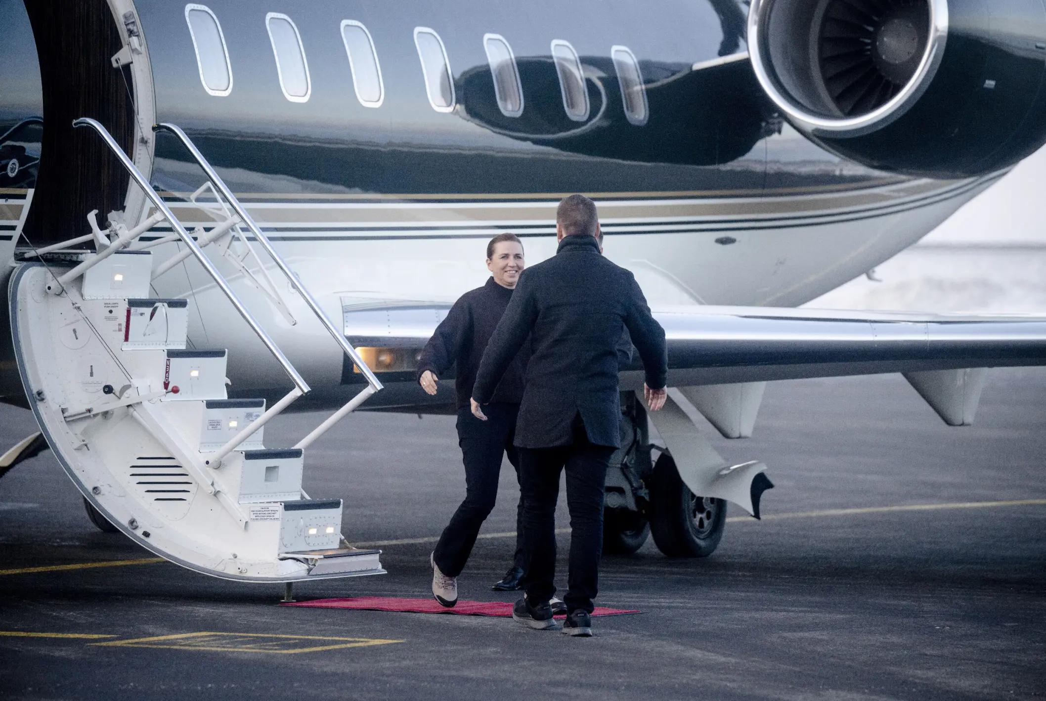 Her forlader Mette Frederiksen og Jens-Frederik Nielsen lufthavnen.