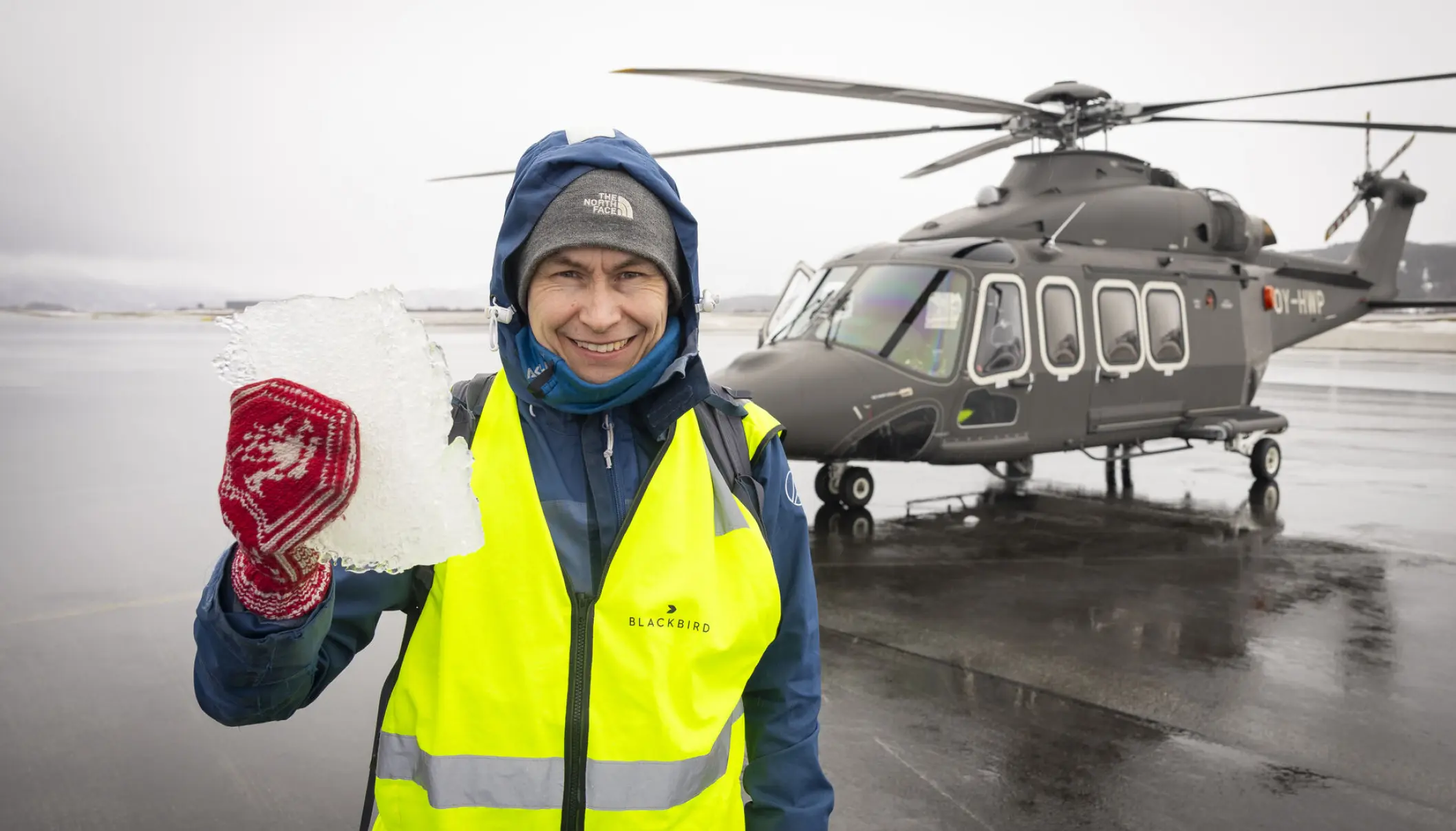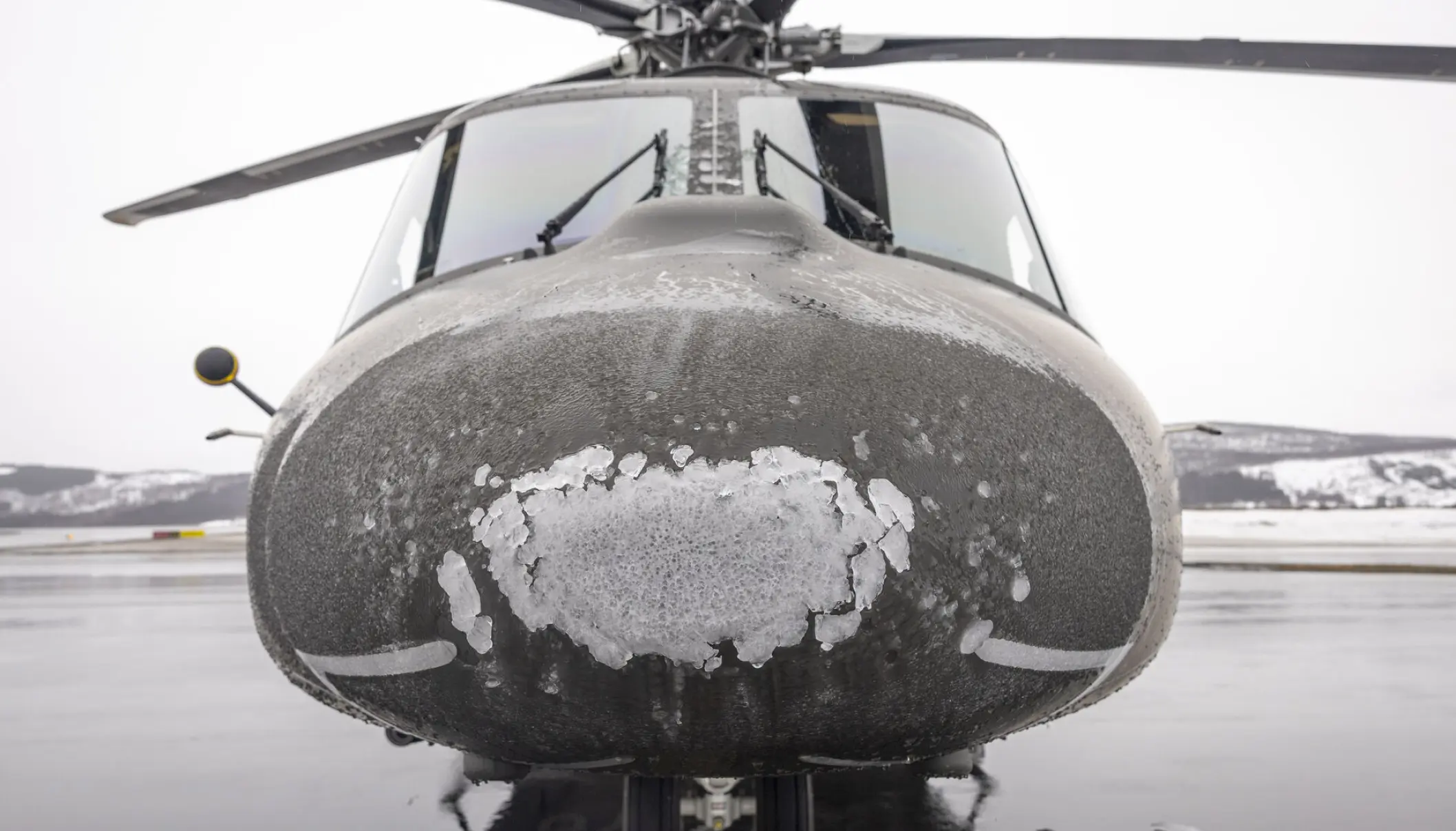Det er bestemt ikke ufarligt, selv om den norske helikopter af typen AW 139 har afisningsudstyr, der med elektrisk varme forhindrer is i at sætte sig på skrog og rotorer, er helikopteren fyldt med is, når den lander.
