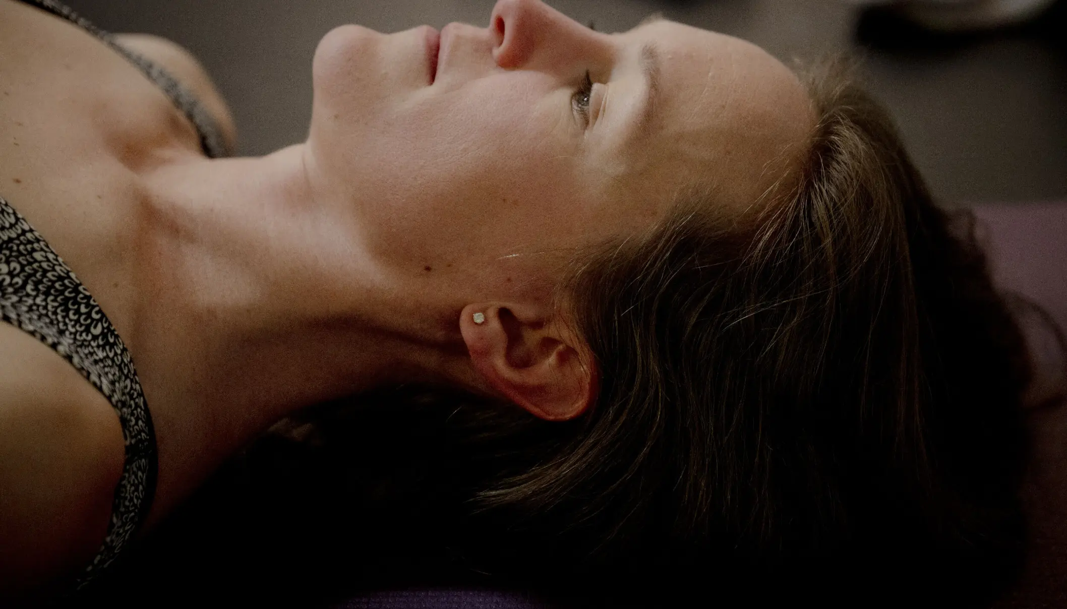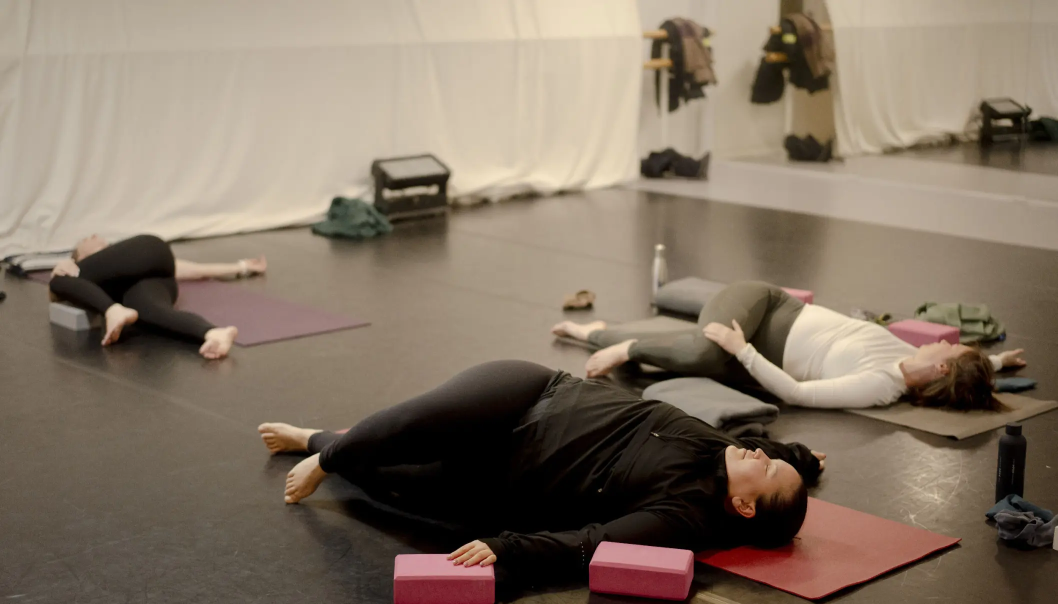 Men det mærker man ikke umiddelbart på yogamåtterne. Folks vejrtrækninger blæser ud i lokalet som en hvislen, og blander sig med lyden af panfløjte og uforståelig, men blød, sang fra en højtaler.
