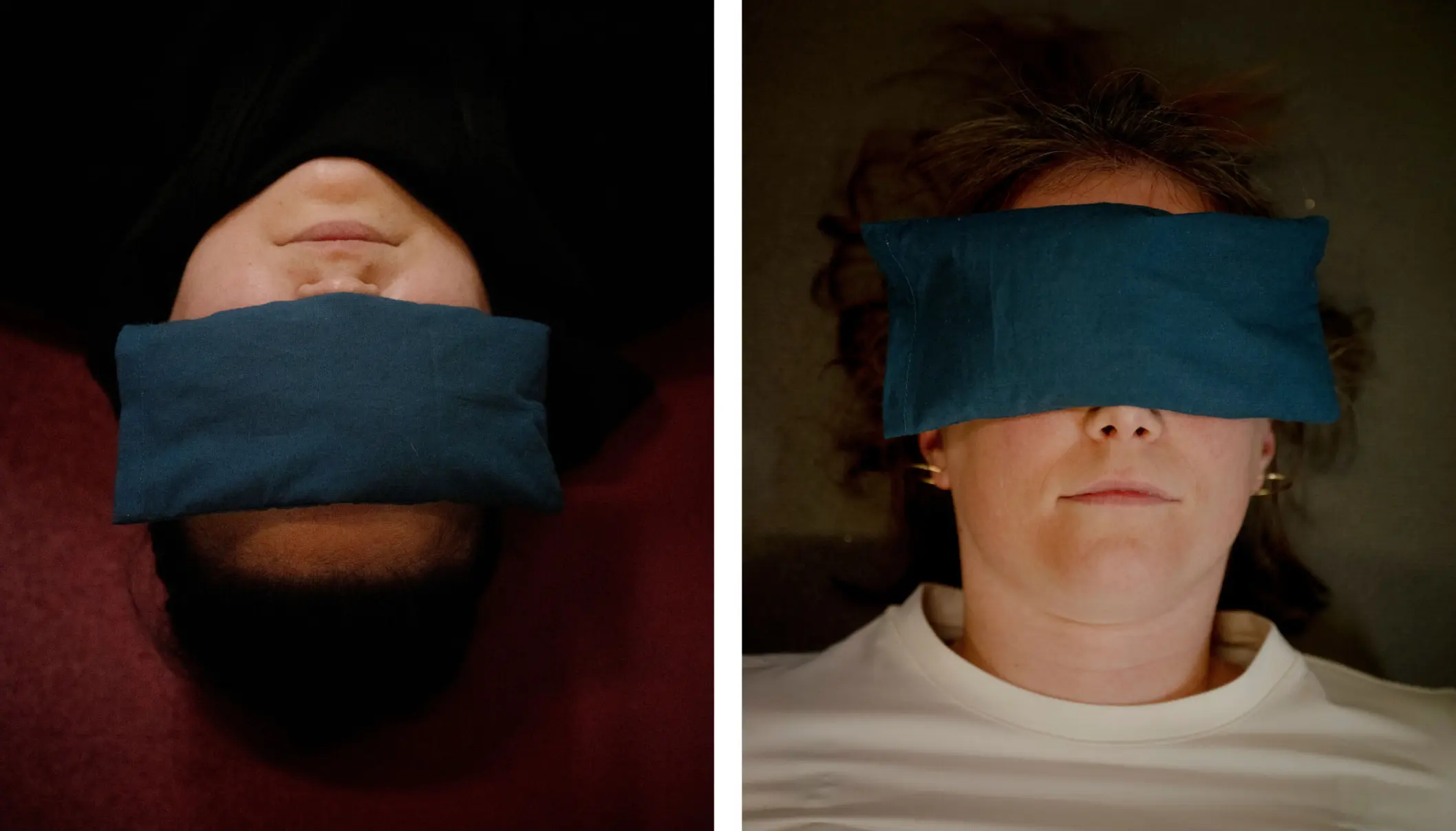 Nini Kleist ligger stille med en lille stofpose over øjnene.