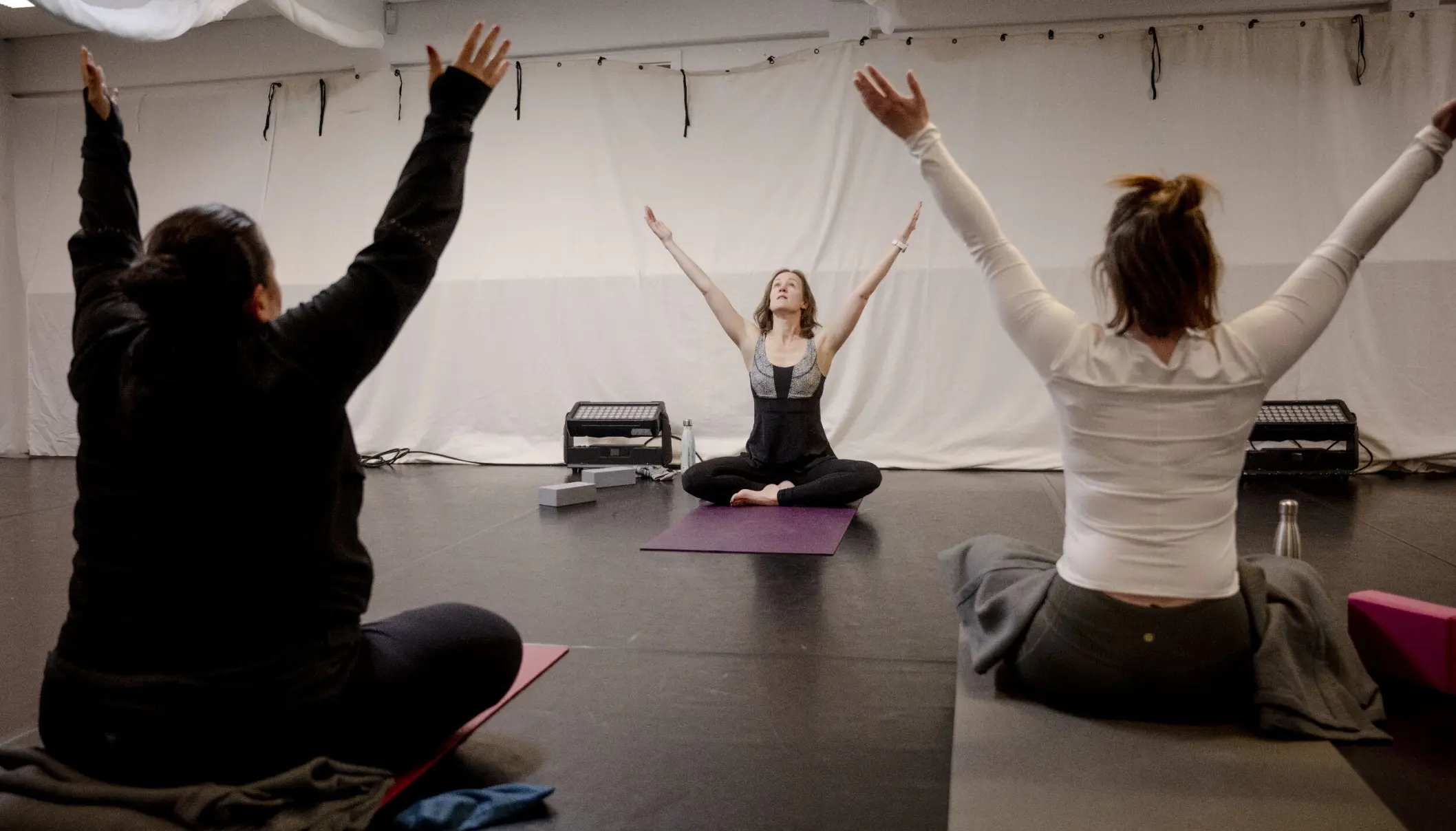 Laura Jacobson Øraker, der underviser, taler dæmpet. Hun sidder i skrædderstilling på sin yogamåtte, mens hun guider forsamlingen igennem forskellige stillinger.