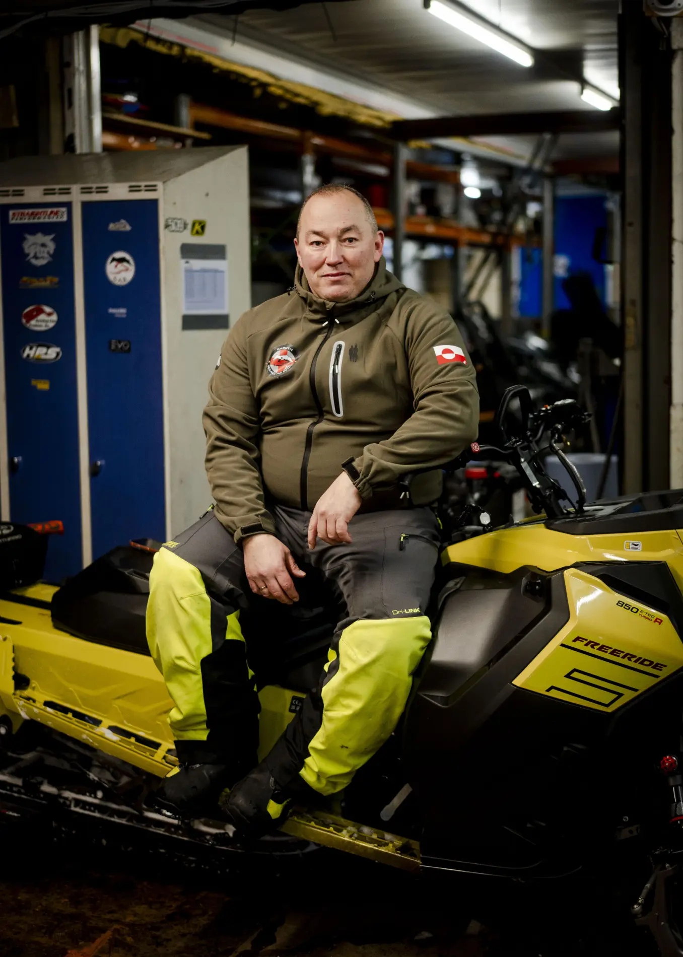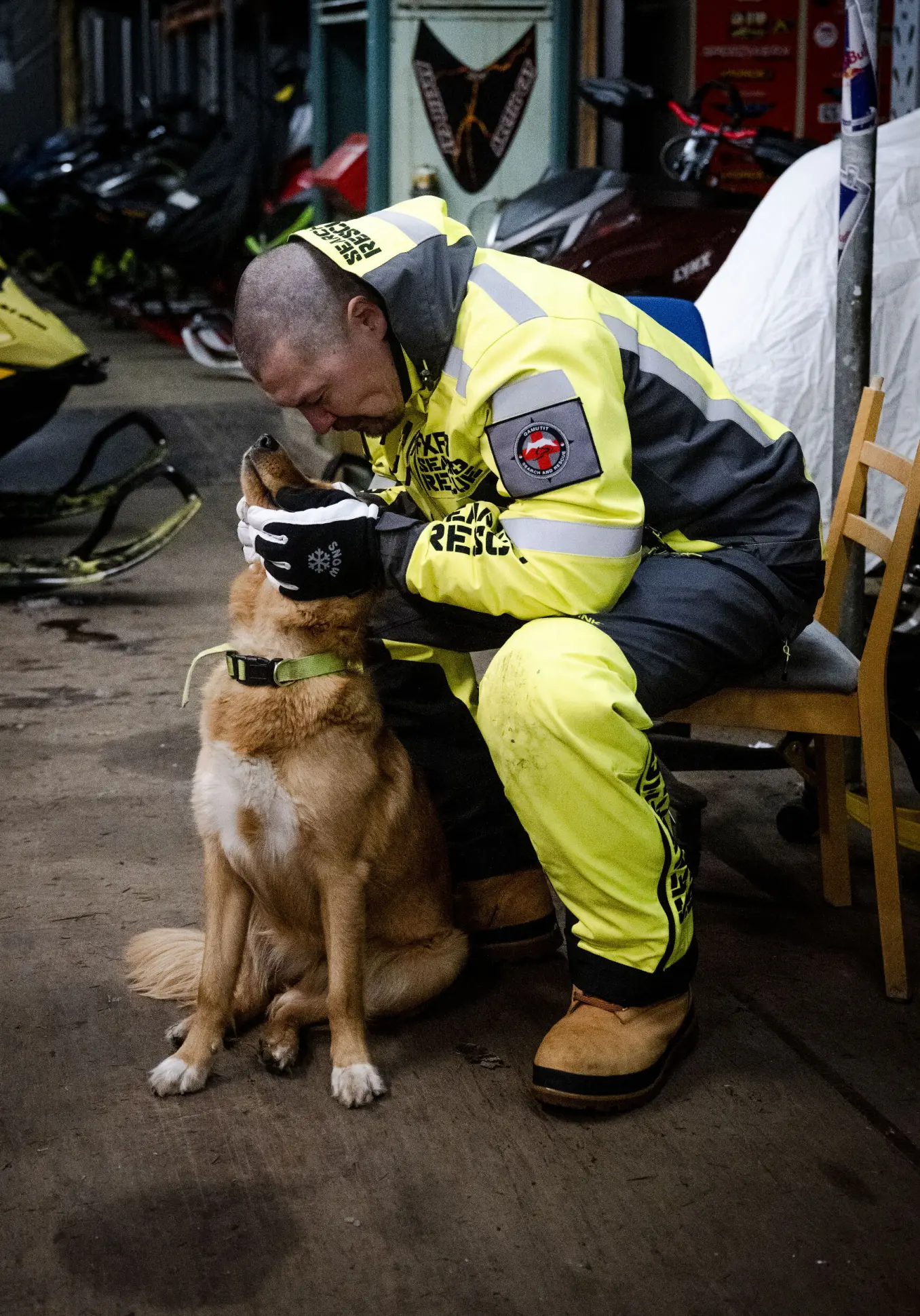 The group consists of 15 volunteers - plus the dog Bambi, who actually belongs to colleague Aputsiaq Davidsen, but who is nevertheless a regular part of everyday life in the snowmobile hall. The dog walks between the machines, nuzzling the people and reminding of the warm-hearted and good spirit that permeates the unit.