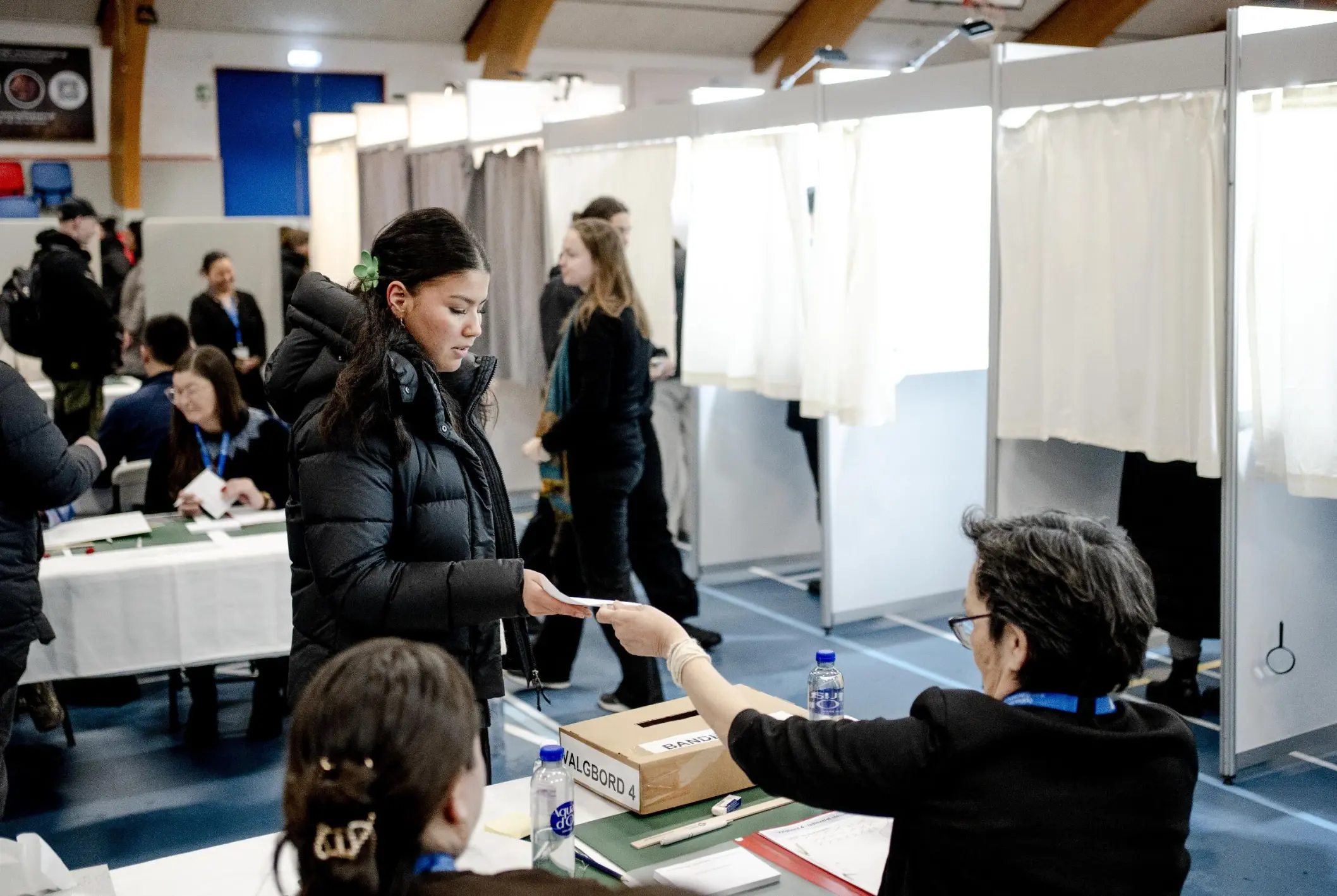 Although the polling station has only just opened, there is activity around Godthåbshallen when the two friends and their classmates arrive.