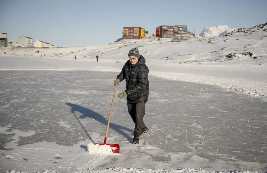 På søen Annersuaq tegner vinteren sit eget idrætsanlæg. Langrendsløbere glider i spor langs den præparerede løjpe, mens en firkant midt på isen markerer noget mere skrøbeligt: Nuuks eneste skøjtebane. Hjemmeskabt. Frivilligt vedligeholdt. Hvert år genopbygget fra bunden.