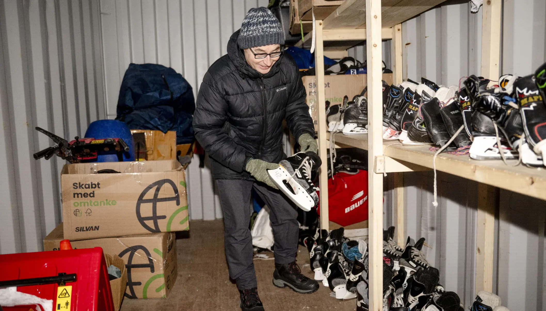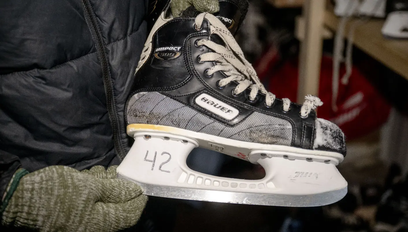De mange skøjter, der i dag kan lånes gratis, bærer deres egen historie. De stammer fra den ishockeyforening, der blev forsøgt etableret i 1990’erne, da han vendte hjem fra Alaska. Dengang ebbede initiativet ud, og udstyret endte i en container – glemt i næsten et årti.