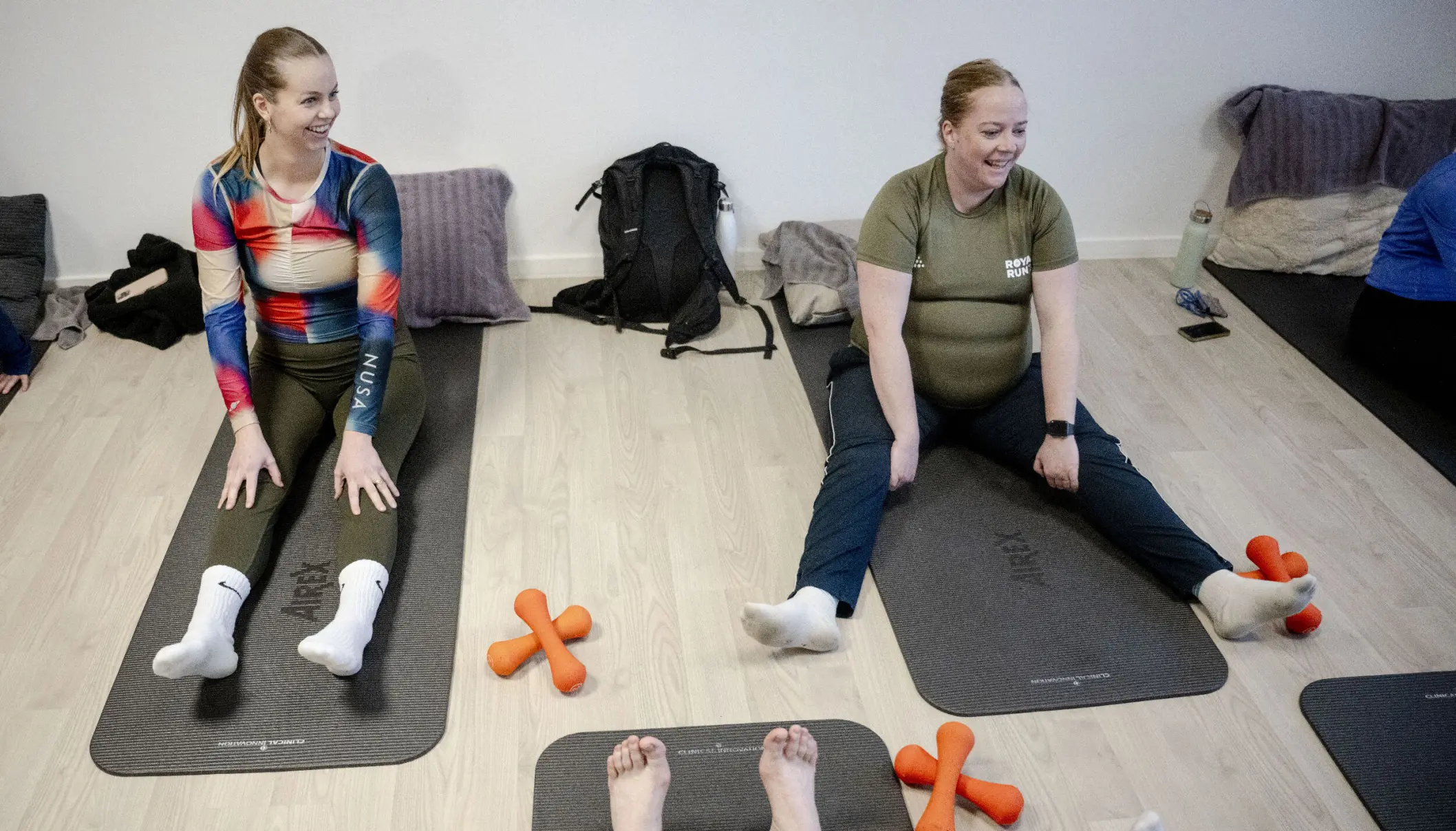 Vi bryder alle ud i grin, nikker anerkendende og fortsætter med at pruste videre – denne gang med et sæt to kilos håndvægte i hænderne.