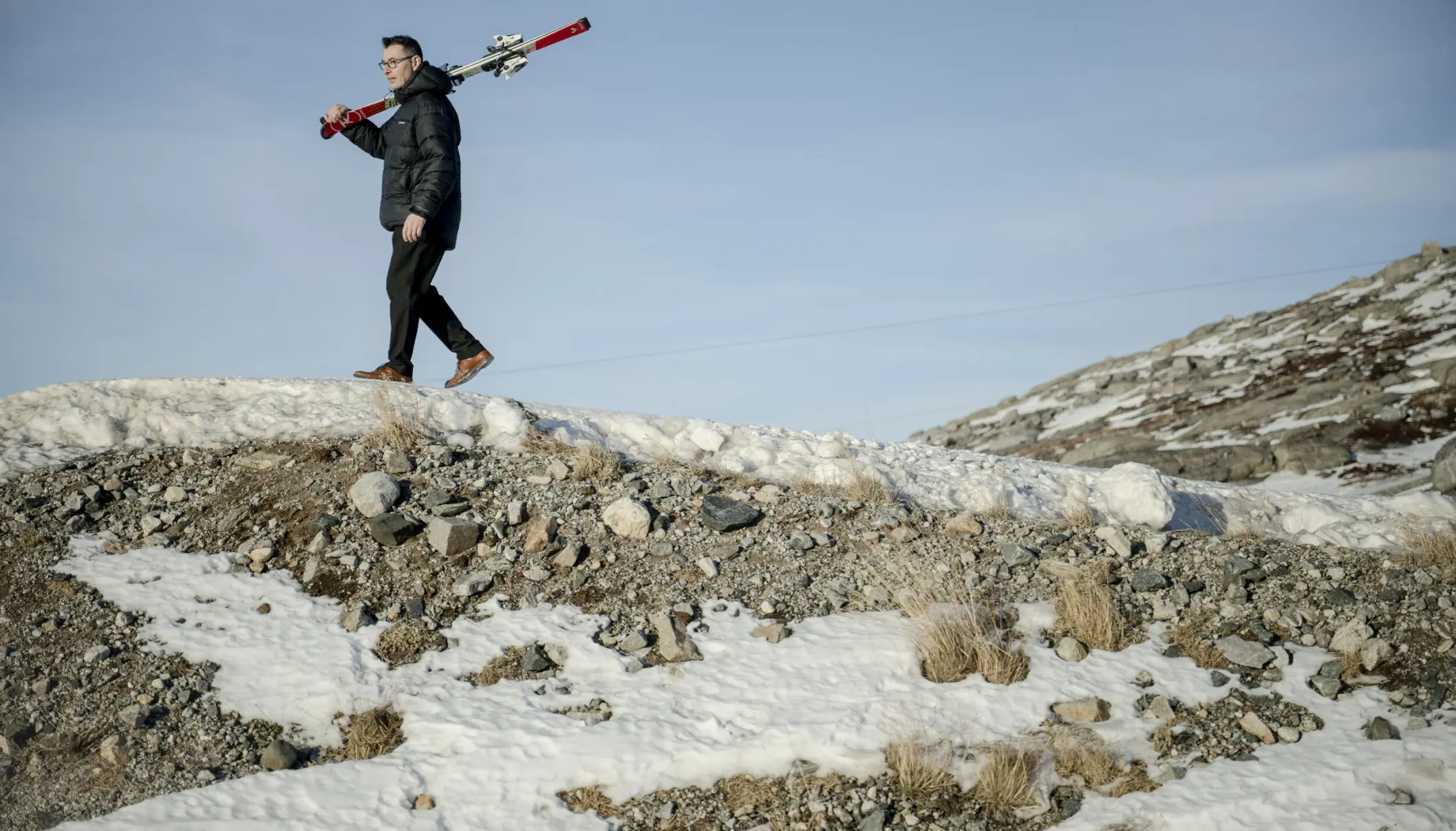 Ved Sisorarfiit-Skiliften er der mennesketomt. Solen bager over fjeldet, fjeldsiderne ligger nøgne, og skiliften hænger stille i luften. Driftsleder Qulu Heilmann står på skråningen iført solbriller og peger ud over terrænet, hvor pisten normalt snor sig ned ad fjeldet.